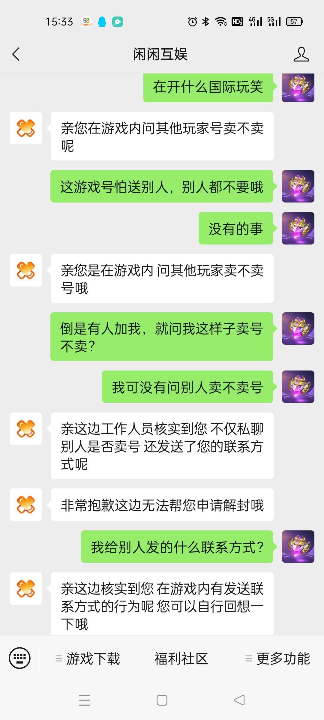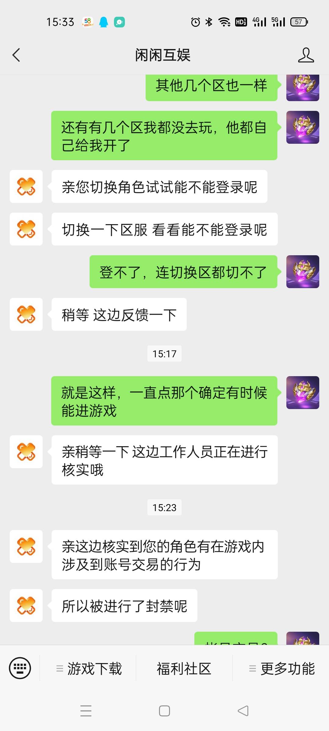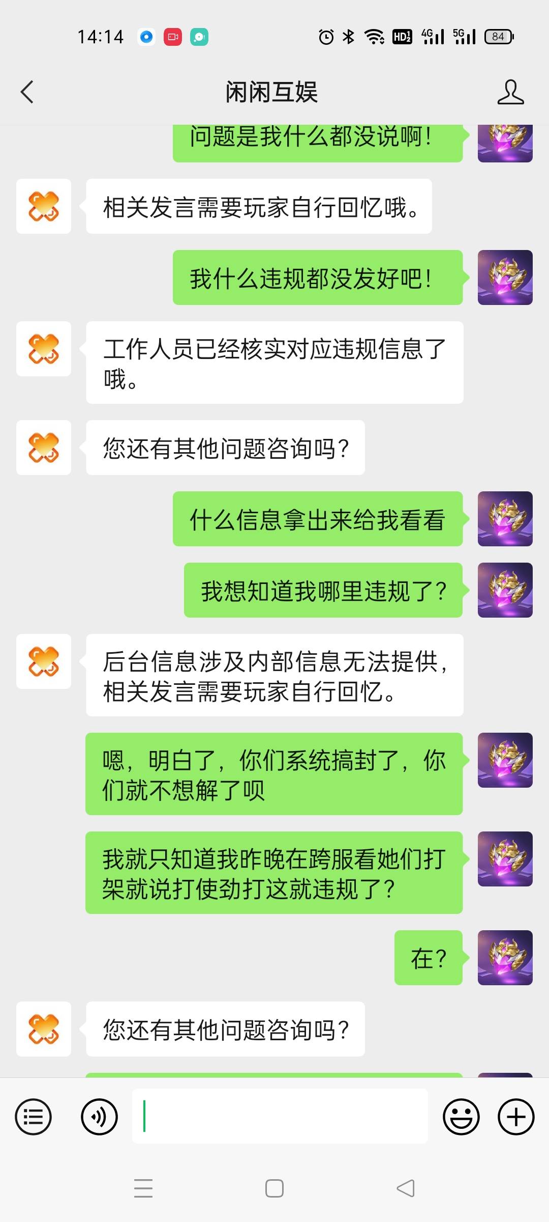 一个客服说是违规,聊天违规,另一个客服说是什么交易账号交易,给我逗乐了
