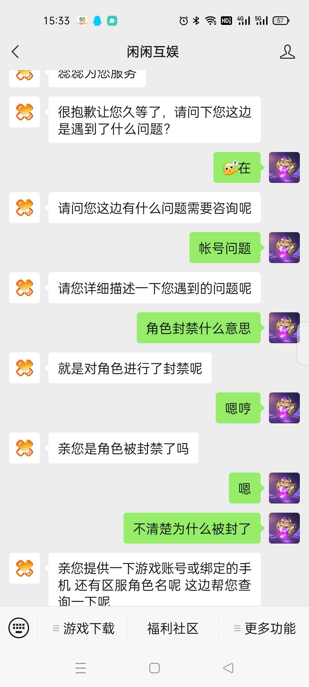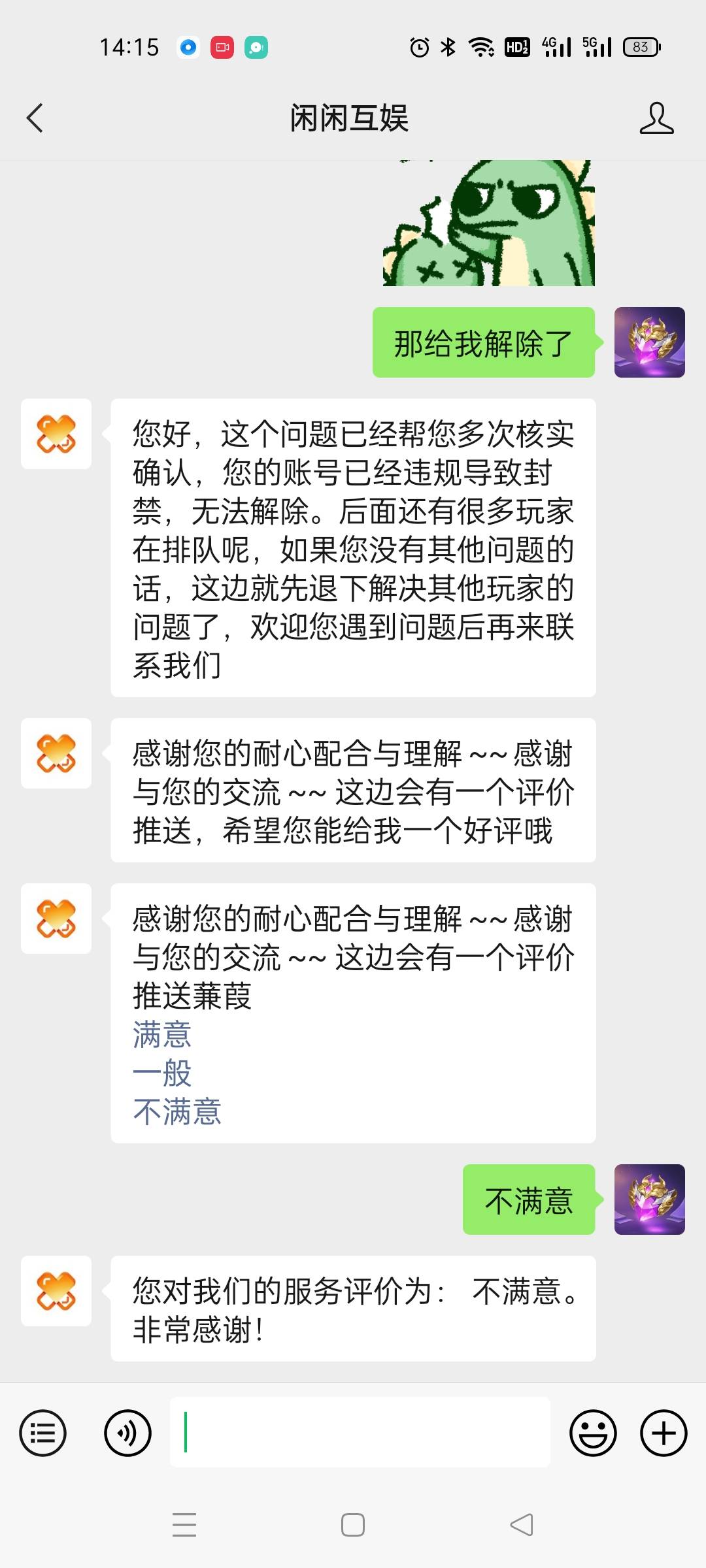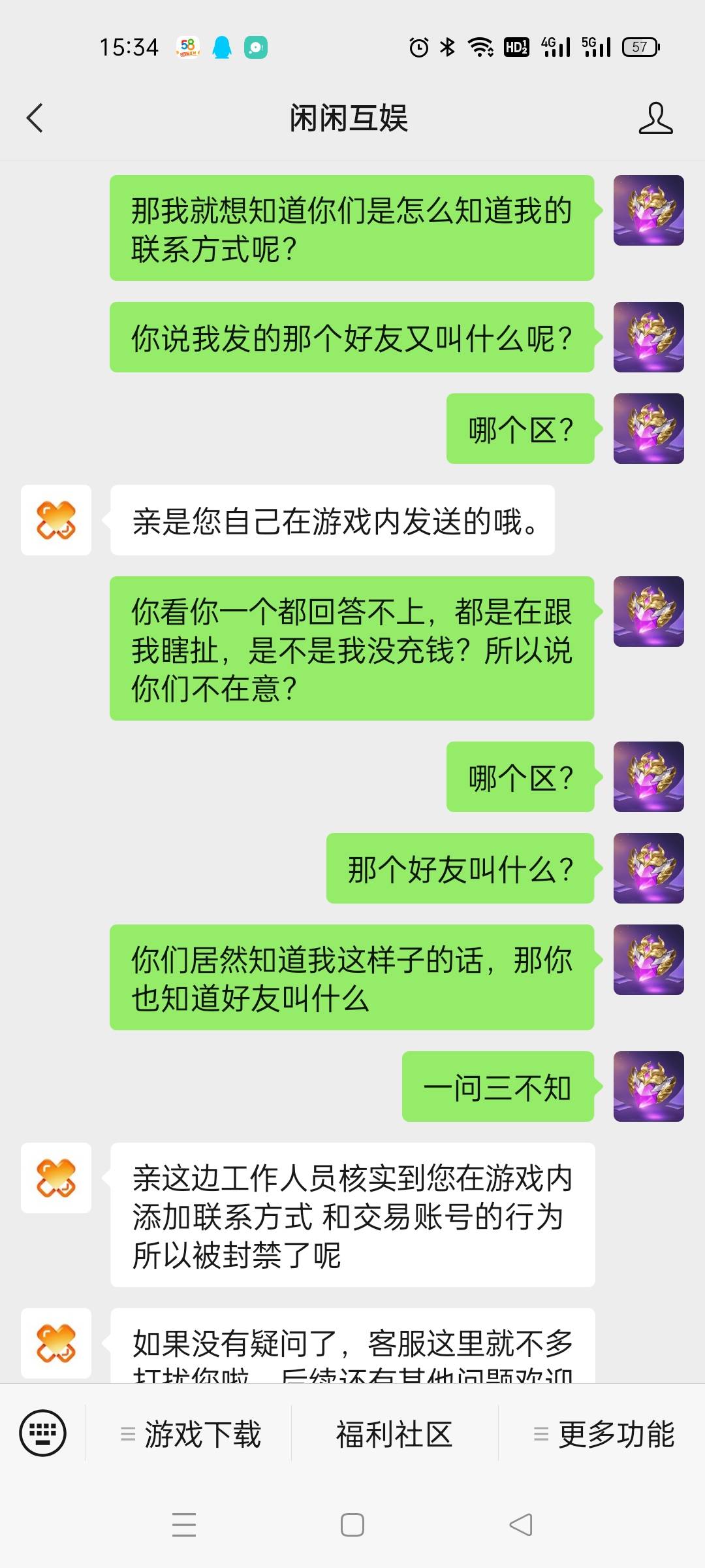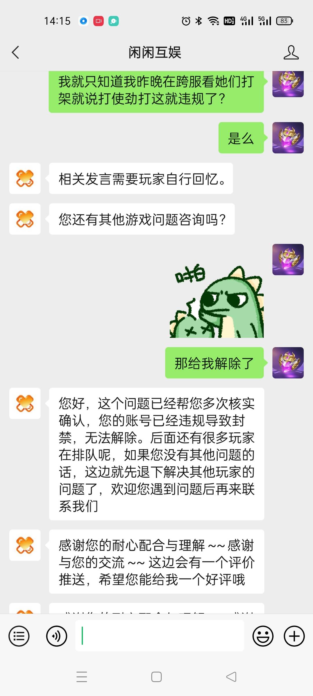 一个客服说是违规,聊天违规,另一个客服说是什么交易账号交易,给我逗乐了