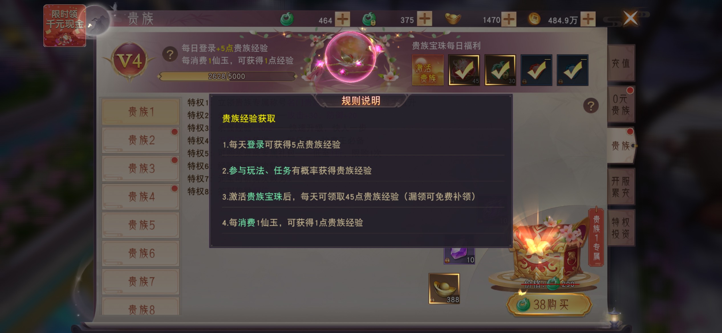 御剑封神小白攻略 休闲玩家怎样成为V4 休闲玩家不行充钱的,游戏第一天会送你一个V1.当然也要完成任务哦! 其次每天登陆会送你5个贵族经验点哦 最后,打一个BOSS有8点贵族经验哦 一个8点10个就是 希望对你有用哦