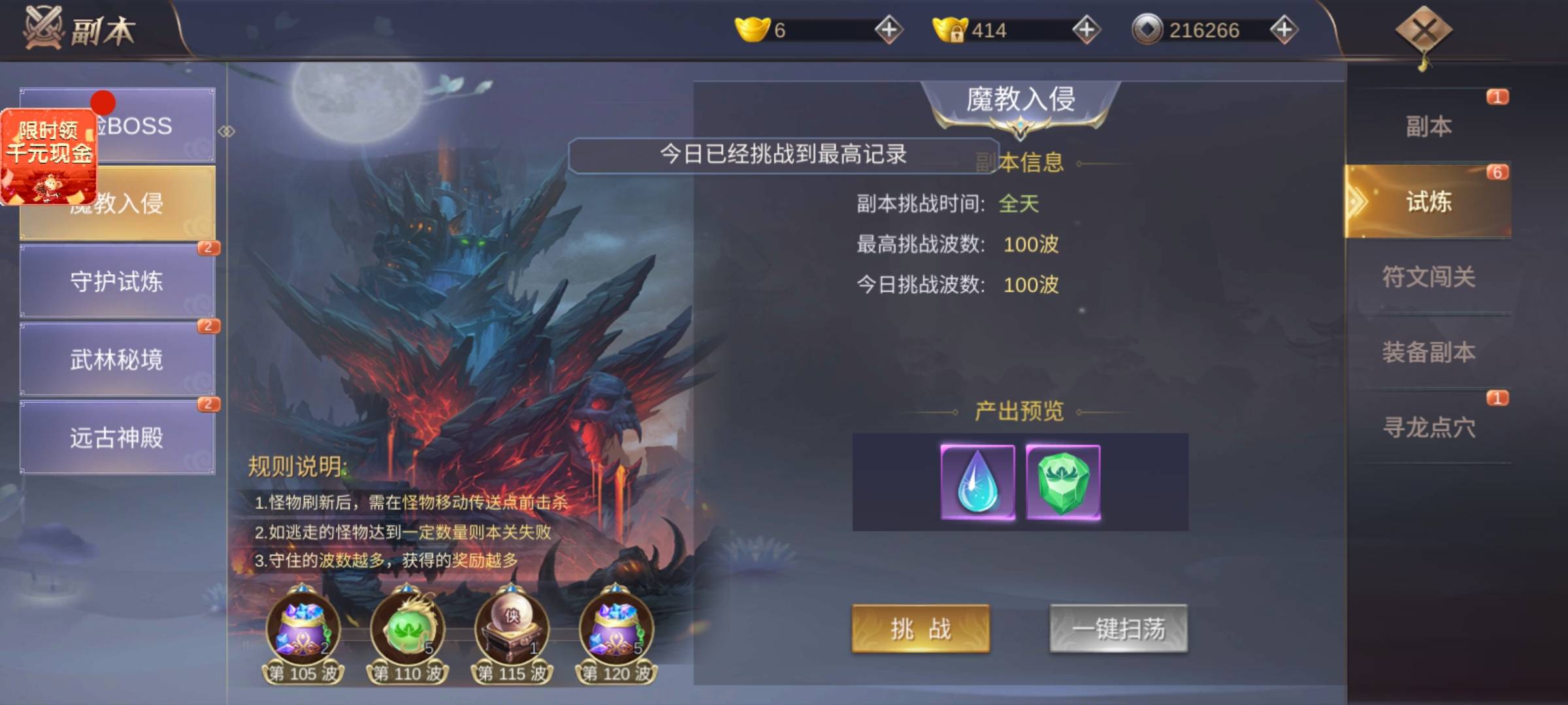 这。。。打完100波不让打了是吧,昨天打完的,今天也不让?还有就是遗迹疲劳boss,没打完给我撤了?BUG有点多吧,这个波数是限制还是bug?