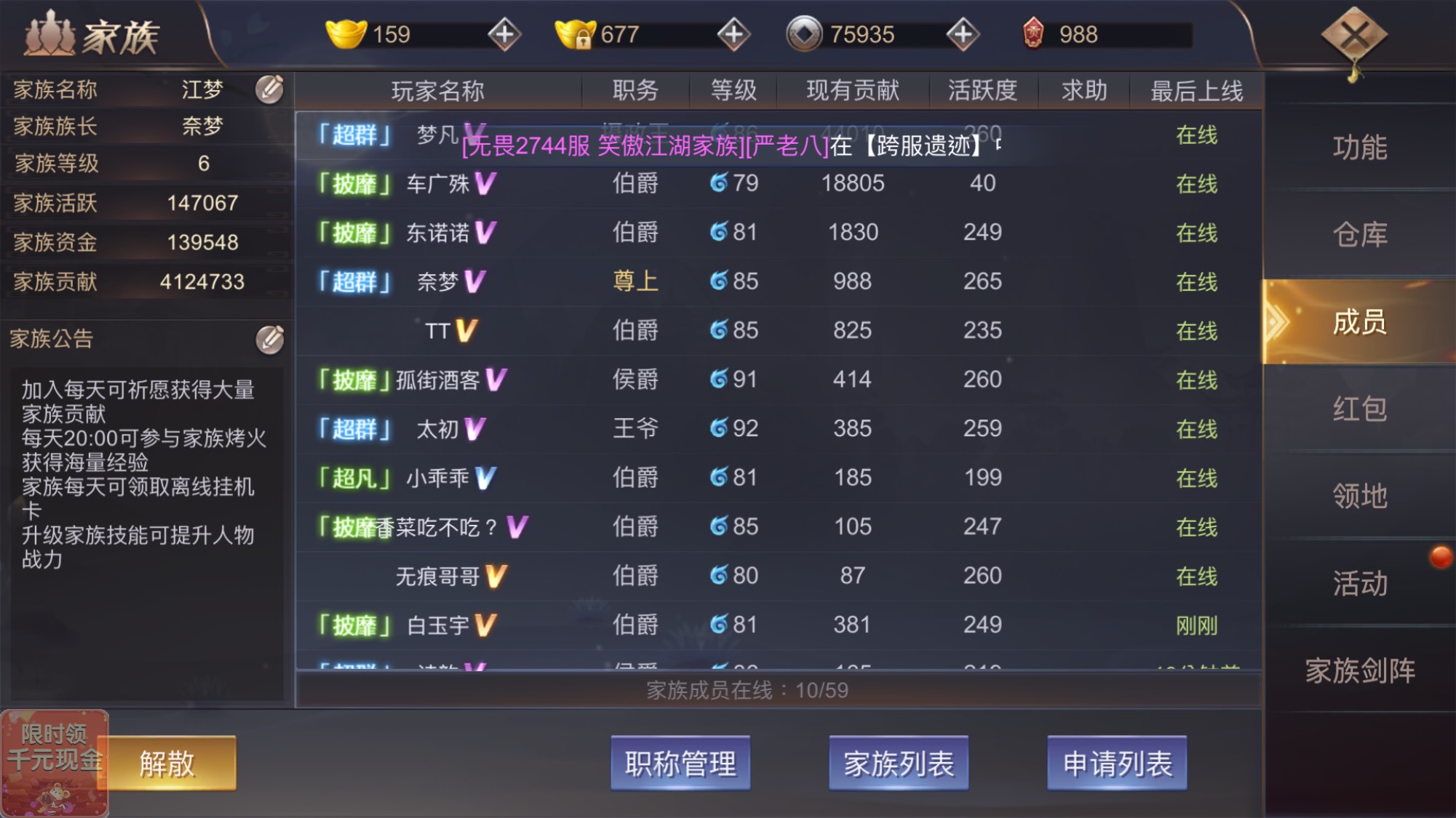 不算新区了,这是日常人数,别的都是活动开始时间才上线,晚上八点之后人比较多,这只是我自己家族的人,不算别的家族的人呢
