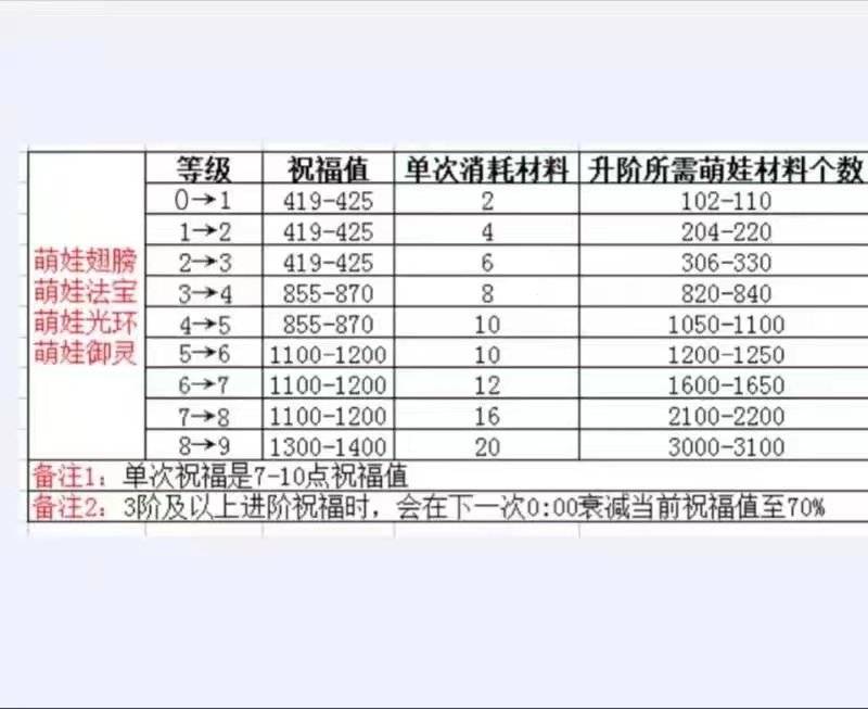 再给大家分享下萌娃翅膀法宝光环御灵进阶所需材料统计表,及三阶后进阶注意事项,见下图