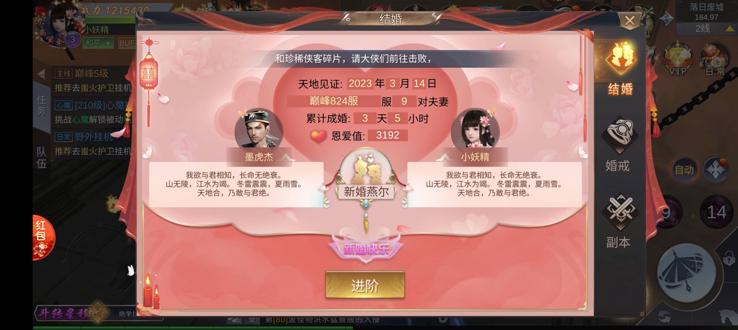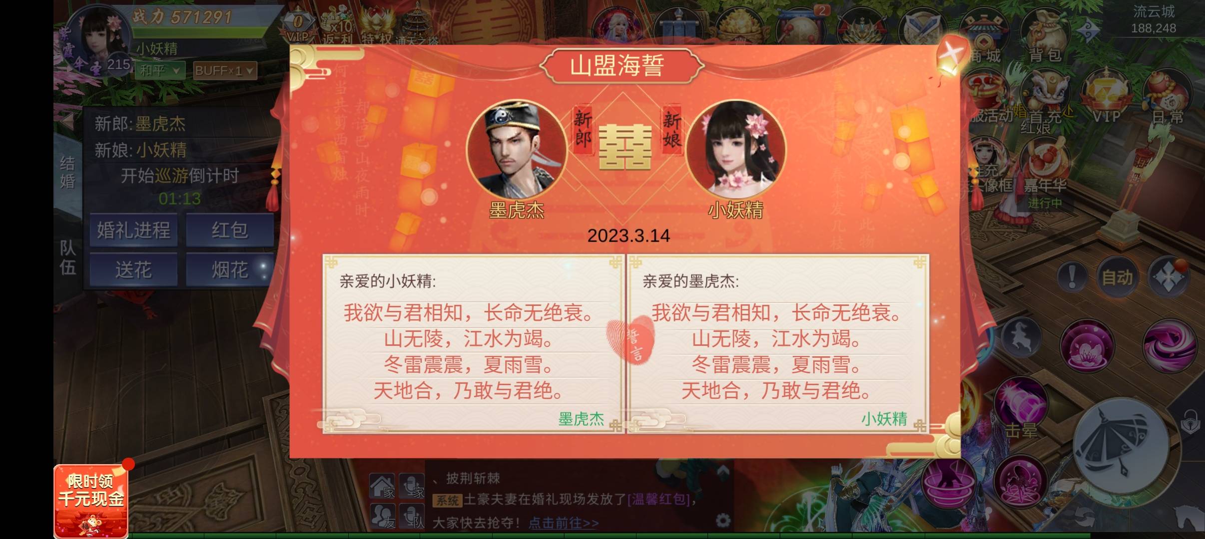 我玩的是天仙道,也是可以结婚的游戏,我都快结婚一周年了,新郎却出海了