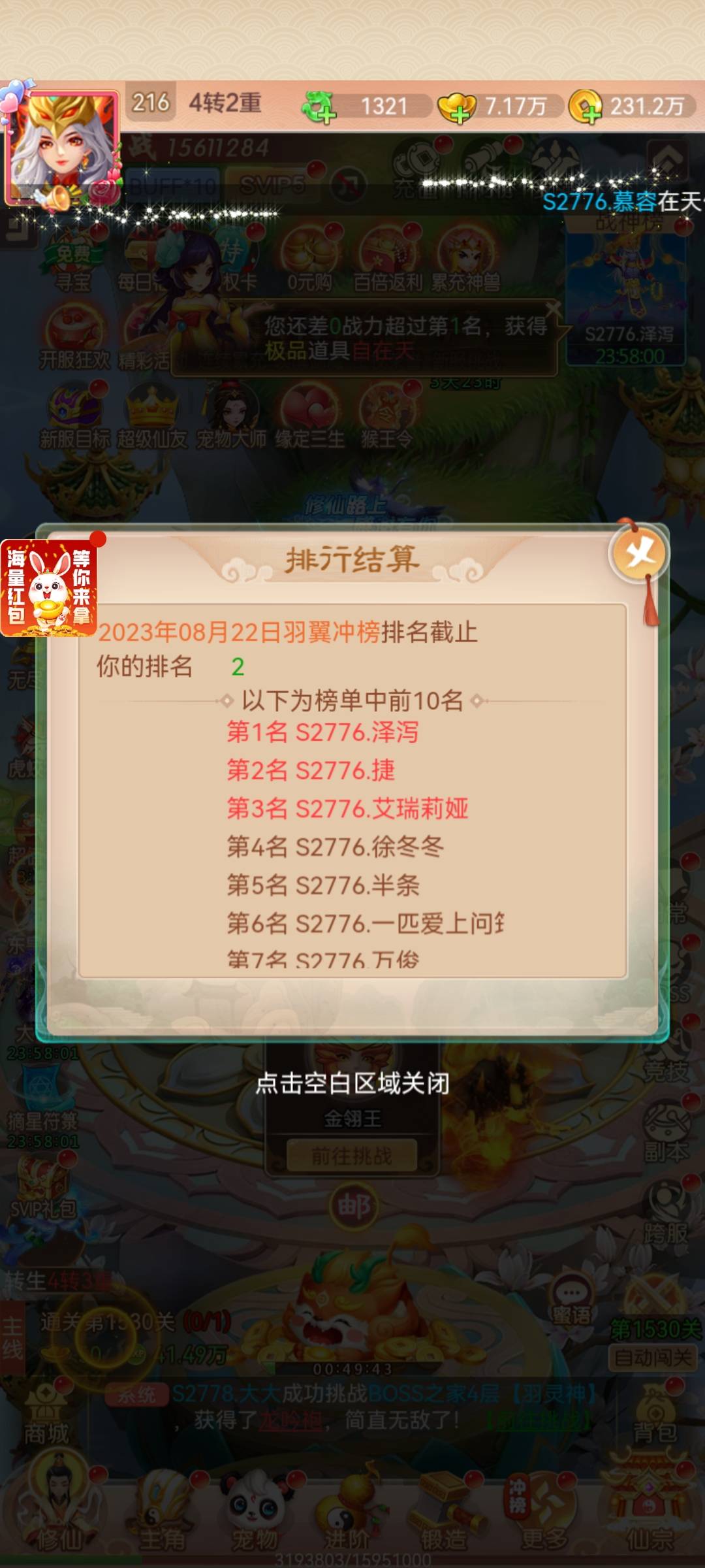 冲榜终于又重新回到第二:但太卷了,单这个服务器V8就4个,V7有11个,还有不计其数的V6和V5,这到底是个啥区啊想我都怀疑我进错了。