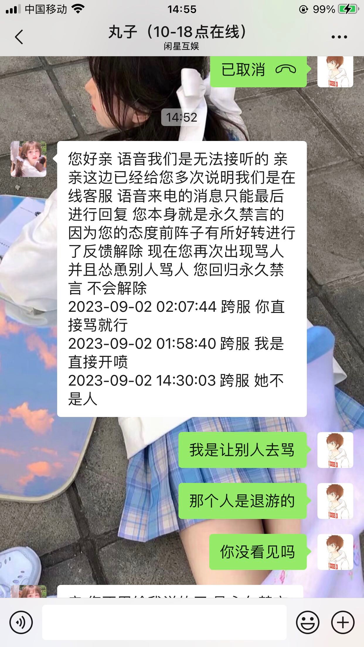 这发言凭啥又封永久,被人举报说我骂人,这是客服给我发的我骂人,完全不公平,我怎么才可以投诉客服乱禁言人,充钱多就可以这样随便举报封别人禁言是吧,禁言永久等于不让玩家玩游戏