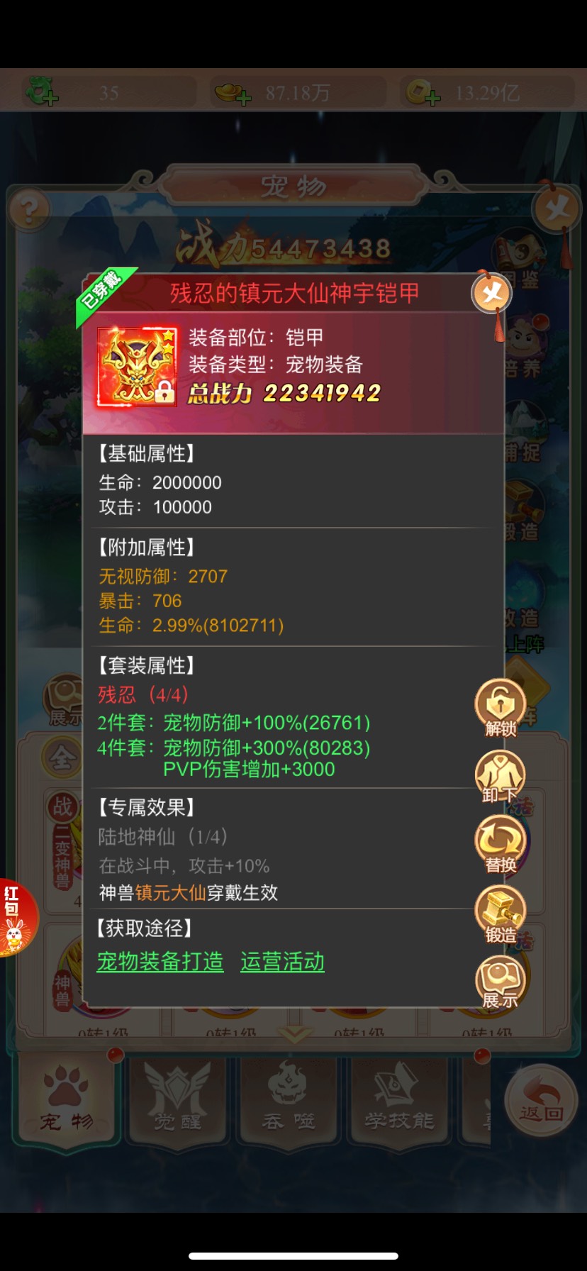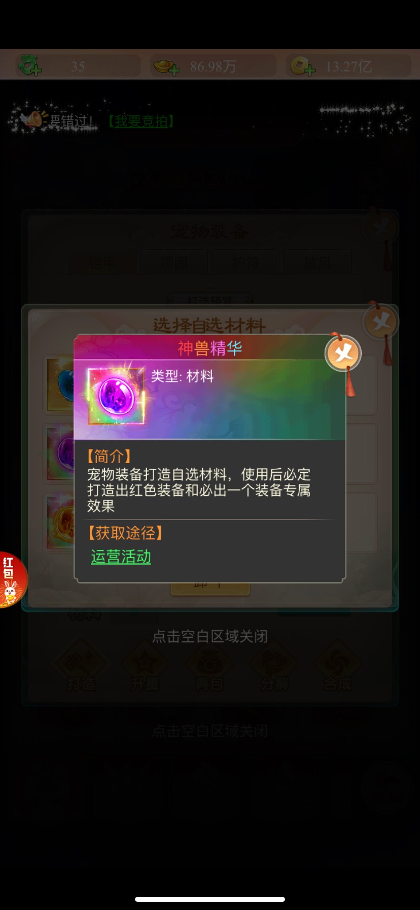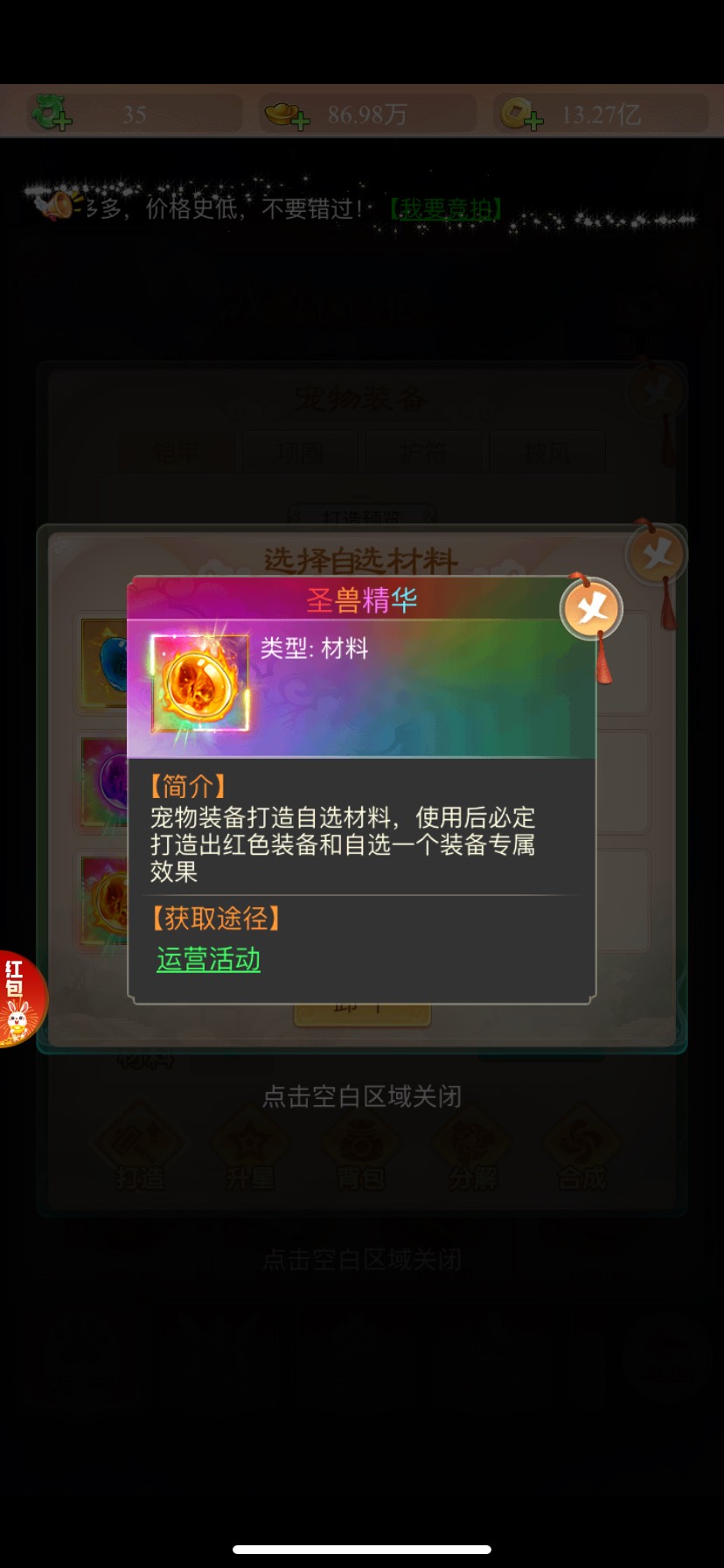 宠物装备会在七境后期更新当中解锁🔓,分别有宠物图录 天晶石(用于宠物打造装备)灵兽精华、神兽精华、圣兽精华(用于打造宠物装备获得更好的属性)