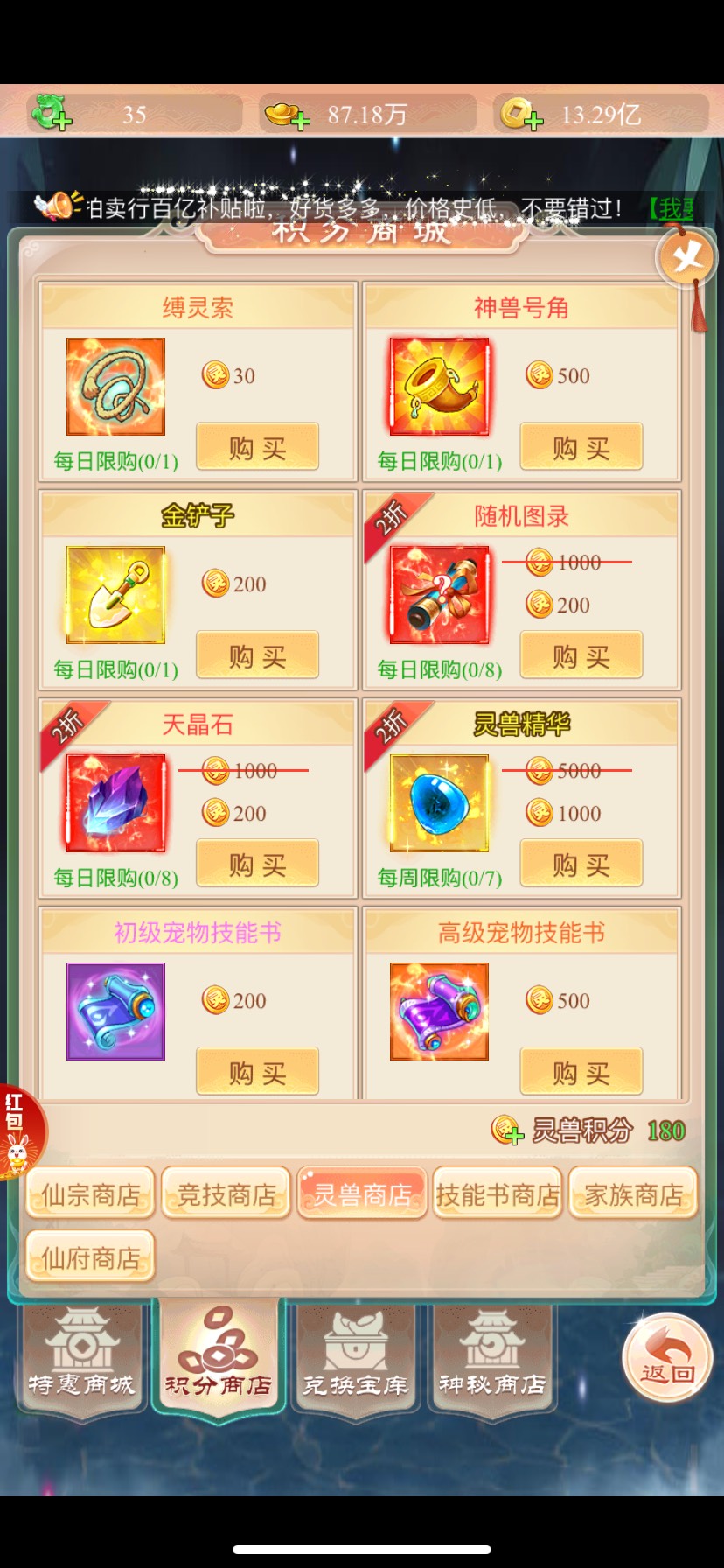 获取方式🎁 材料 可以通过宠物园抓取宠物获的灵兽积分,积分🉑️在灵兽商店兑换获得 以及每日的通关副本也🉑️获得相应的材料,关于灵兽商店兑换方式,小编这边建议大家前期优先兑换宠物图录 因为前期打造会比较缺,当然也可通过每月的“烟花盛会”活动中通过耗资元宝或充值不同金额💰放烟花🎆的形式也可获得哦!所以这边小编建议各位七境友友们元宝千万不要乱花,仙玉也是记得囤起来,(当然氪佬除外)